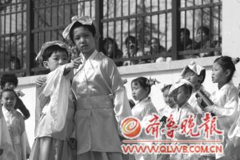 ◤28日,在郑州路第二小学,学生们穿着古装吟诵《黄鸟》、《清明》等经典诗词。当日,学校举办“感受清明 缅怀先贤”吟诵活动,用这种方式让学生们更好地了解中华民族的传统文化。 本报记者 杨宁 摄影报道