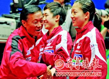 | 3月31日,主教练周树森(左)在比赛结束后和队员庆祝胜利。当日,在德国多特蒙德进行的第51届世界乒乓球团体锦标赛女子半决赛中,新加坡队以3:2战胜韩国队,晋级决赛。 新华社记者 马宁 摄