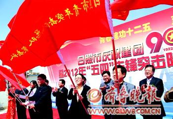 团市委、市发改委、市蓝办联合表彰了2011年度日照市五四先锋突击队、突击手,为2012年度大项目建设青年突击队总队授旗。图为青年突击队代表们接过队旗。