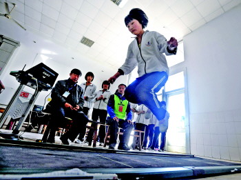 本报4月13日讯(记者 杨凡 实习生 翟楠楠) 13日是2012年济南市初中学业水平体育测试第一天。今年,济南首次使用电子设备测量立定跳远成绩,部分考生反映不太适应,考试成绩比平时训练时稍低。立定跳远成为部分考生的失分项目。 记者了解到,在考试前,尽管已有部分学校提前使用电子设备进行训练,但是一些学生对于电子设备测量,还是表示“不适应”,以往并不难完成的立定跳远也成为部分考生们的失分项目。 “和平时训练感觉不一样,成绩低了5厘米,丢掉2分。”在济南西藏中学考点,刚完成测试的济南育文中学考生刘鹏说,“满分10分,我们这一组跳远基本都是8分,九个人中有两三个人感觉没跳好。” 据了解,初中体育学考首日进行的测试项目包括身体形态(身高、体重)、掷实心球、立定跳远、运动技能(篮球运球、足球运球、排球垫球选一),这些项目测试持续到20日。23日至25日,统一进行耐久跑测试,由各县(市)区负责组织、考生所在初中学校具体实施。