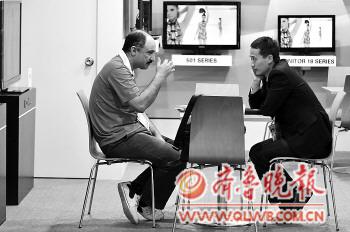 | 15日,客商在广交会一家参展液晶电视企业的展位洽谈。 新华社发 |