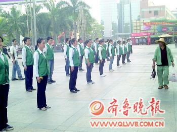 时间:2012年3月7日 自述:商场前,有员工在进行队列训练,正巧一男子从整齐划一的队伍前走过,像在检阅他们。 点评:整齐划一,不怕人检阅。
