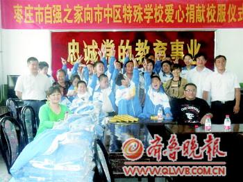 15日,市中区特殊学校迎来了一群身有残疾的朋友。这13位来自枣庄自强之家残疾人协会的爱心人士,给孩子们送来了崭新的校服和画笔。 本报记者 袁沛民 本报通讯员 王英杰 摄影报道