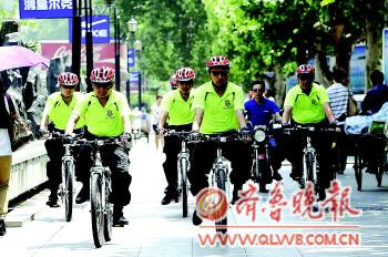 5月18日,在济南泉城路上,济南首支“保安骑巡队”正在进行巡逻。据介绍,历下保安联合山东众安成立了泉城首支由40余名保安队员组成的“保安骑巡队”,该骑巡队配备了16辆自行车和2辆巡逻车,将于周末、节假日期间穿梭于大街小巷之间,协助驻地保安及辖区派出所保障治安环境。