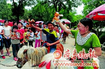30日,在济南动物园,来自历城区特教学校的50多个孩子和小动物亲密接触。图为第一次骑上小矮马的孩子们特别高兴。