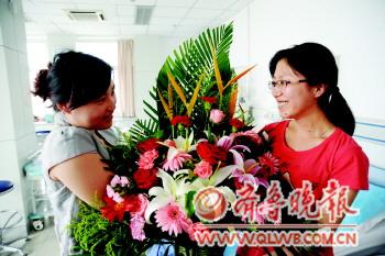 | 捐献结束后,张燕的好友为张燕(右)献上鲜花表达祝福。