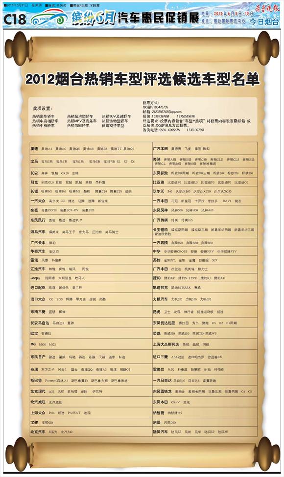 2012烟台热销车型评选候选车型名单