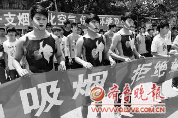 | 31日,在山东科技职业学院校园内,一场“拒绝烟草,珍爱生命”的戒烟宣传活动拉开帷幕。几位学生用行为艺术在校园内倡导戒烟,迎接世界无烟日的到来。 本报记者 吴凡 摄 |  | 一网吧内,一名上网者正在吸烟。