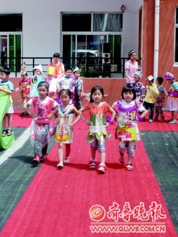 5月31日,市中区的幼儿园和小学纷纷举行活动欢度儿童节。枣庄市市中区现代幼儿园举办了一场以环保为主题的走秀表演活动。小朋友身穿家长用塑料袋、垃圾袋和旧报纸等用品制作的服装现场走秀。