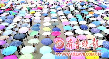 市中区中兴小学为了防止学生们在夏季皮肤被日光灼伤事情的发生,指导学生们如何利用遮阳伞,预防日光灼伤的知识教育。学生们利用遮阳伞组成“六一”字样的图案。