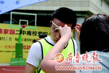 | ◤队员在场上你争我抢,比赛非常激烈。 本报记者 钟建军 摄 |  | 头上的绷带掉了,女朋友为他绑结实。本报记者 钟建军 摄 |
