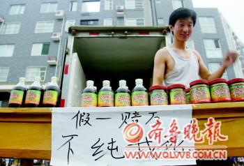 在德城区尚学路上一香油摊前,摊主孙先生打出“假一赔万,不纯我死”的标语。孙先生称,敢写这样的标语是因为自己的香油保质保量。