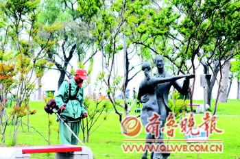 作品描述:园艺师专心地修剪着草坪,对旁边跳舞的人视而不见。哦,原来只是一组雕塑。