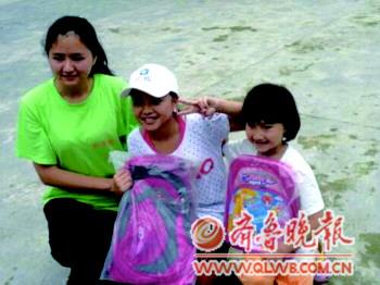 | 孩子们收到书包很开心,志愿者用手机拍下照片传给记者。 |