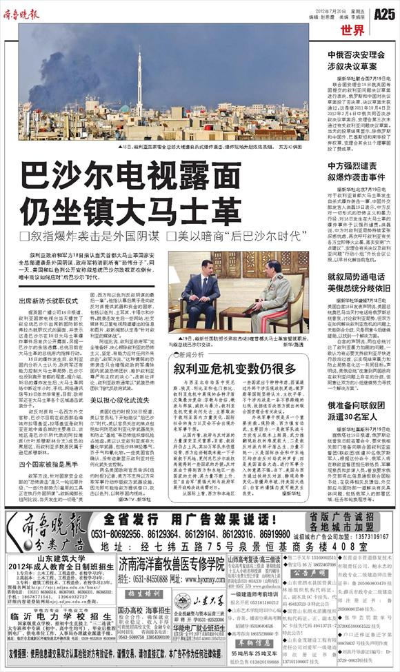 巴沙尔电视露面仍坐镇大马士革