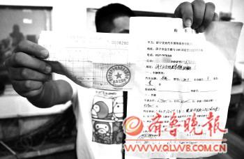 | 汽车销售店大门紧锁。李岩松 摄 |  | 孙先生当时签订的合同与开具的收据。李岩松 摄 |