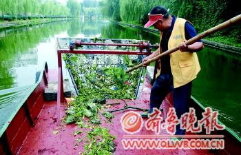 | 经过改装的新打捞船。 刘守善 摄 |  | 河道保洁员在打捞水生植物。