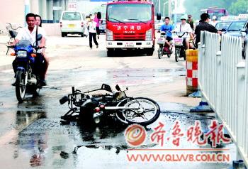 24日中午,市民王先生驾驶一辆摩托车经过太白楼路与建设路交叉路口时,摩托车突然起火,引燃了油箱,所幸路口执勤的交警及时拨打了119电话,火势被随后赶来的消防员扑灭。“可能是天气太热了,当时起火前我加了一下油门。”王先生告诉记者,摩托车自燃时,先是引燃车体表面的油污,后来火势很快变大,当时他到附近商家借来几桶水想把火扑灭,但已经来不及了。 本报记者 刘守善 摄