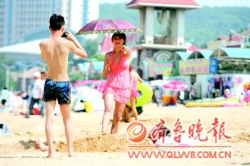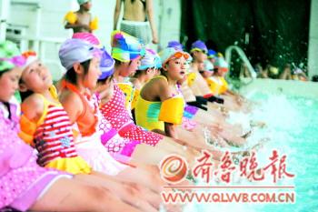 | 烟台市游泳馆内,等待下水的小朋友正在热身。本报记者 赵金阳 摄 |  | |  | 游客们避暑有高招。 |