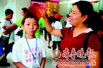 24日早上,小报童黄守鹏把订的报纸合好后,妈妈给他带上帽子准备出发卖报纸。