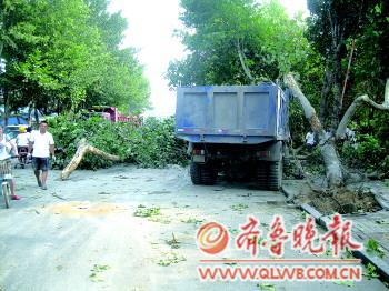 本报7月24日讯(记者 彭彦伟 通讯员 张浩) 24日凌晨2点50分左右,在日照北路日照一中西校附近,一辆拉水泥的货车为躲避对面车辆,“窜”到人行道上,造成侧翻。4棵30多年碗口粗的法桐被连根拔起,所幸货车司机只受轻伤,目前事故具体原因正在调查中。 24日上午7点,热心市民拨打本报热线8308110称:在日照北路日照一中西校附近,一辆拉水泥的货车“窜”到路边后把树撞断了。随后记者赶到现场发现,交警、环卫以及园林等部门工作人员都在现场。一辆货车停放在路边的人行道上,车头已经变形。 事故中,货车将路边的4棵法桐树撞倒,其中3棵连根拔起。在现场记者发现,树干顶端就是高压电线,有些被撞断的树枝挂在电线上。据悉,这些法桐有30多年的树龄了,“撞断了挺可惜的。”一名围观市民说。 据现场一位救援人员介绍,事故发生在凌晨2点50分左右,拉水泥的货车由南向北行驶到日照北路与天德路交叉口附近时,为躲避迎面车辆,急转方向冲到了路边的人行道上。“当时货车发生了侧翻,水泥洒落一地。”该救援人员说,“我们凌晨3点左右接到电话就过来救援了,散落的水泥被另一辆车拉走。” 所幸货车司机只是受了轻伤,目前事故具体原因正在调查中。