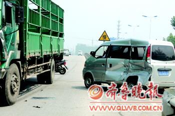 24日上午,泰安市儿童医院附近的龙潭路上,一辆大货车和面包车相撞,面包车左侧严重变形,所幸没有人员伤亡。