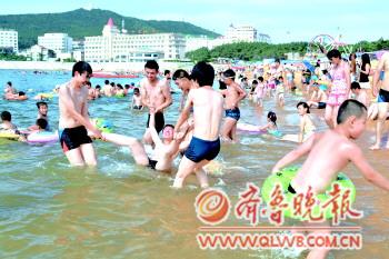 24日,国际海水浴场人流涌动。据了解,当天威海最高气温达到29.7摄氏度,来海水浴场游泳的市民明显增多,五颜六色的泳衣构成一幅美丽的海岸风景。 本报见习记者 赵辉 摄