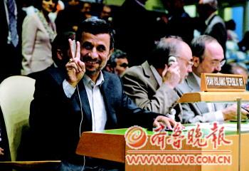 | ◤9月24日,在美国纽约,伊朗总统内贾德出席联合国有关法治问题的高级别会议,作出胜利手势。 东方IC供图 |