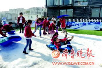27日,在青岛开发区金沙滩景区,一座小型的冰雪世界首次亮相,吸引了很多小朋友前来玩耍。据冰雪世界项目负责人独孤勇介绍,冰雪世界将在国庆期间正式对外开放,让游客体验到秋季滑雪的乐趣。 本报记者 潘旭业 摄影报道