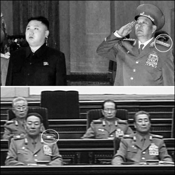 上图:玄永哲站在金正恩一边行军礼。图片显示其戴着大将肩章。