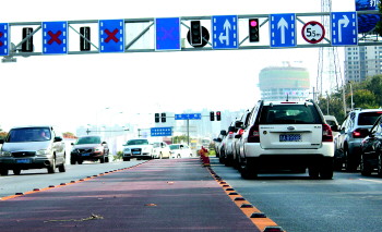 潮汐车道闲置,多数车主不知该怎么走。 本报记者 修从涛 摄