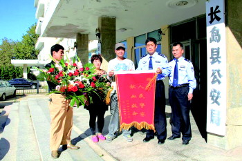 本报10月11日讯 11日上午,长岛城区居民孙先生一家人,手捧花篮和一面绣着“人民警察 献血救命”的锦旗送到县公安局,对城区派出所民警郭江1日献血救了孙先生儿媳妇一命的行为表示感谢。