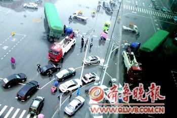 | 三车合力终将大货车拖离现场。 本报记者 牟张涛 摄 |  | 车祸现场,交通受阻。 本报记者 马志勇 摄