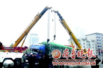 本报11月4日讯(记者 牟张涛) 11月4日3时20分,湖滨大道和三八路交叉口,两大货车相撞,一车逃离现场,另一车严重受损,8个小时之后,该车辆才被拖走。据了解,该路段禁止大货通行,依然有司机冒险。 11月4日9时许,天上飘着小雪。记者在现场看到,一辆长10米左右的运煤大货车停在路中央,车头冲北和车身垂直,车头“面目全非”,前挡风玻璃粉碎,地面上有不少煤和车辆脱落下的零部件,最远的零部件距货车已接近10米,现场不时发出噼啪的声音,十余位交警正在现场维护交通。 现场一辆拖车以及两辆吊车正在救援。吊车将吊绳挂在货车车身的前部,拖车将拖绳挂在车头上。据了解,因车头和车身垂直,如果拖车直接拖拽大货车,大货车极易翻车,拖离就会更加麻烦,因此如想拖车,需将车头摆正。 经过一个多小时的工作,两辆吊车和拖车共同工作,吊车将车身吊起,拖车将车头摆正。11时30分许,拖车将大货车缓慢拖离现场。 据大货车司机介绍,当时他自西往东经过该路口,一辆闯红灯的大货车从南往北也经过这路口,两辆车相撞。“那辆车是红色的,拉的沙子,和我这辆车大小差不多,我的车头撞到它车尾上了。”该车司机说,两车相撞后,他的车停下,而那辆车拐到非机动车道往北开走。 “3时20分许,我们当时正在值班,忽然听到哐的一声。”永和豆浆三八路店工作人员介绍说,当时正飘着雪,他们跑出去后看到一辆车停在路口,另一辆大货车往北开走,“副驾驶员被卡在车里,我赶快拨打了报警电话。”德州市公安局消防大队民警王胜宾介绍说,该车副驾驶员被消防战士使用扩张器将其救出,其脚部骨折。 据了解,该路口禁止大货车通行,该大货车并没有办理通行证。“目前交警部门正在严查大货车闯禁行。”德州市交警支队直属一大队民警介绍说,大货车闯禁行将被罚款200元,驾驶证扣3分。