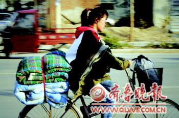 4日,一名骑自行车的女学生前面用棉衣挡风,车子上带着两床被子。当天,菏泽虽是阳光明媚,但最低温度只有3℃,此次大幅降温幅度达8℃,市民们出行大都全副武装。