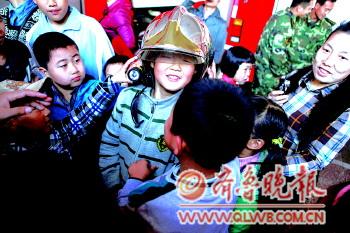 ◤一名小朋友戴上消防头盔,让大家十分羡慕。