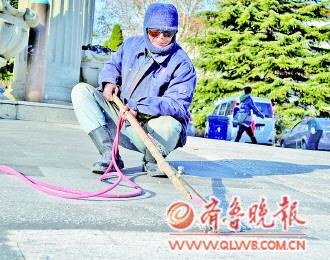 4日,两名工人用明火烘烤市立医院南门大坡路面。这道坡用条纹整齐的大理石铺筑,雨雪天气防滑效果差,用急火烘烤后,路面条纹变深且没有规律,增强防滑功能。