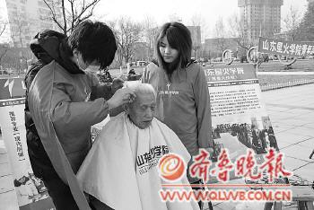 ◤ 来自山东星火职业培训学院的志愿者服务队自带发电机,在市博物馆广场为市民免费理发。
