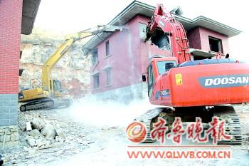 本报12月6日讯(记者 殷亚楠) 6日,济南市国土资源局历城分局、历城区城管执法局、历城区仲宫镇政府,联合对仲宫辖区内7处共约1万平方米的违章建筑进行强制拆除。据有关负责人介绍,这是近几年来历城区最大规模的一次集中拆违。今年以来,历城区城管执法局共拆除违章建筑5.3万平方米。 6日上午,历城区仲宫镇东泉泸村一条山间公路旁,山坡上有五栋别墅,主体建筑已经完工,外墙已贴完瓷砖,4辆铲车开进,随后开始凿墙、拆除,不长时间,最东边的一处别墅就被拆了个支离破碎。 仲宫镇政府有关负责人介绍,国土部门通过卫星监测,早在今年三四月份就发现这处山坡上有人在平整土地、堆砌石块儿,随后工作人员找到了这里,给当事人下达了停工通知。可当事人并不理会,并抱有侥幸心理,到了七八月份开始打地基动工建设。国土部门、城管执法局先后多次下达停工通知和自行拆除通知,但并没有阻止别墅的建设。当事人趁着节假日、夜间偷偷施工,别墅逐渐长高。据介绍,这些野别墅都是当地村民建设的。“自行拆除期限到了之后,我们按程序对这些违章建筑进行强制拆除。”这位负责人表示。 据该负责人透露,6日当天除了对东泉泸村3000平方米的野别墅进行了强拆外,还将对东平坊村、东老泉村等其他6处违章建筑进行拆除。7处违章建筑面积共有1万平方米,这是近几年来历城区最大规模的一次集中拆违。历城区城管执法局有关负责人说,这些违章建筑破坏自然资源、扰乱社会秩序和社会公平,至此历城区今年已拆除约5.3万平方米的违章建筑。