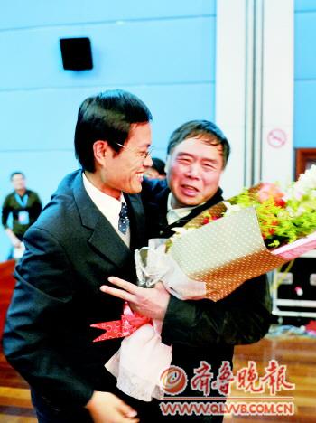 | 么富江见到徐本禹(左)激动不已。本报记者 王媛 摄 |  | “张刚大篷车”颁奖现场捐赠新农村爱心图书2000册,鹿海斌与张刚(右)热情拥抱。本报记者 王鸿光 摄 |