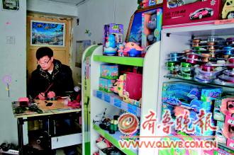 | 郭修金在店铺内维修玩具。 记者 王震 摄 |