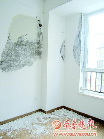 | 一位业主家里墙面渗水,只好磨掉墙皮打算重来。 记者 侯艳艳 摄 |