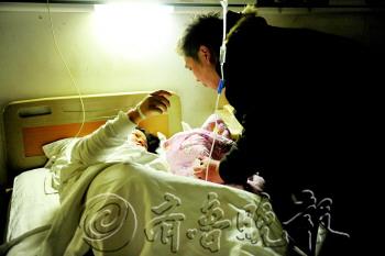 上图:28日19时48分,济南西站,为了转运一名羊水破裂的孕妇,G43次高铁多停5分钟才离站。在众人接力下,孕妇张影(化名)被火速送到医院,于21时40分平安产下一名男婴。 本报记者 徐延春 摄