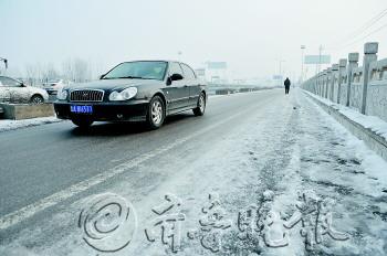 23日,济南经十西路玉符河大桥,车辆在冰雪路面上小心行驶。市区路面冰雪已经基本解决,但市郊的许多桥梁道路仍被冰雪覆盖。