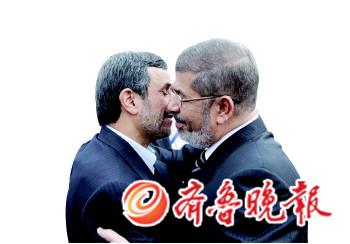 伊朗总统马哈茂德·艾哈迈迪—内贾德2月5日中午抵达埃及首都开罗,成为两国断绝外交关系30多年来访问埃及的首位伊朗总统。埃及总统穆尔西亲率庞大队伍在开罗机场迎接内贾德,两国关系回温格外引人注目。 现场 欢迎仪式隆重热烈 艾哈迈迪—内贾德专机5日抵达埃及首都开罗机场,埃及总统穆罕默德·穆尔西亲自迎接。 埃及媒体称,穆尔西为内贾德举行了隆重的欢迎仪式:地上铺着红地毯,军乐队高奏两国国歌,气氛异常热烈。两人在红地毯上握手,相互亲吻脸颊(左图)。 内贾德在5日当天举行的记者招待会上也表示,他希望访问能成为伊埃关系的“新起点”。 内贾德于5日晚些时候拜访逊尼派宗教学院爱资哈尔清真寺,与逊尼派宗教领导人谢赫艾哈迈德·塔伊布会面。 据了解,内贾德还将参加在开罗举行的伊斯兰合作组织首脑会议。 花絮 内贾德遭人扔鞋 据英国广播公司报道,内贾德在开罗参观一家清真寺时,遭人扔鞋抗议。 一家土耳其新闻机构拍摄的录像显示,当时内贾德正在与民众握手,场面很拥挤。一名男子突然脱下鞋子向内贾德扔去,嘴里还喊着“懦夫”。鞋子没有打中内贾德,他在安保人员护卫下急忙离开。扔鞋者被现场的安保人员逮捕。 据了解,由于伊朗什叶派与逊尼派的宿怨,以及伊朗支持叙利亚巴沙尔政权,有不少埃及民众反对内贾德。而在阿拉伯世界里,向人出示一只鞋子代表一种严重的侮辱。 历史 一场革命导致断交 媒体评论称,内贾德此行是对去年8月穆尔西德黑兰之行的回访,标志着两国关系开始升温。 伊朗1979年发生伊斯兰革命,埃及同年与以色列签署和平协定,逐渐成为美欧在中东地区的盟友,伊埃于1980年断交。 埃及还向流亡的原伊朗国王提供庇护,伊朗则以1981年暗杀时任埃及总统萨达特的凶手的名字命名首都德黑兰一条街道。 穆尔西去年8月赴伊朗首都德黑兰出席不结盟运动领导人会议,成为30多年来首位访问伊朗的埃及国家元首。 现实 叙危机成新焦点 两个中东地区重要国家领导人举行历史性会面,双方就如何结束持续近两年的叙利亚冲突交换意见。 法新社报道,两国在叙利亚冲突中所持立场对立。伊朗支持叙总统巴沙尔·阿萨德,对叙政府提供援助,还承认向叙利亚支援伊朗伊斯兰革命卫队军事顾问;埃及支持叙利亚反对派。 6日至7日举行的伊斯兰合作组织首脑会议预计就叙利亚冲突发表公报。路透社记者5日获得公报草案,草案将主要责任归于叙政府,立场倾向叙反对派。
