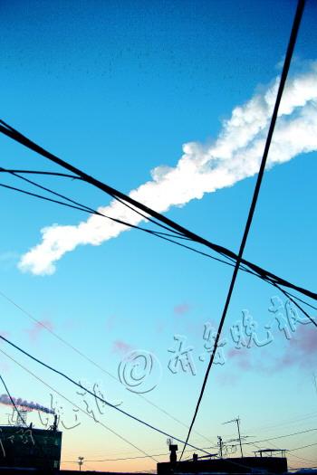| 2月15日,在俄罗斯车里雅宾斯克,坠落的陨石在空中留下轨迹。 新华/路透 |