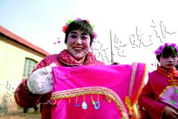 正月初一,烟台海阳龙山街道,表演秧歌的演员开心地笑。 本报记者 张晓鹏 摄