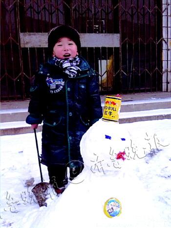 @培清妈妈:又一场雪,初三的雪,给儿子堆了个小雪人,又就地取材,给她戴上红牛帽子,穿上大纽扣斗篷,媚眼眯着,口含桃红,原来是个睡美人!儿子还嫌不好,拿着小铁锨转着圈“装饰”。