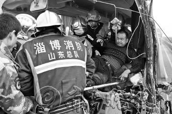 | ◤消防队员将大客车司机救出。