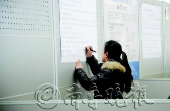 图为一家企业的招聘人员在现场改动招聘简章,增加职工待遇方面的内容。